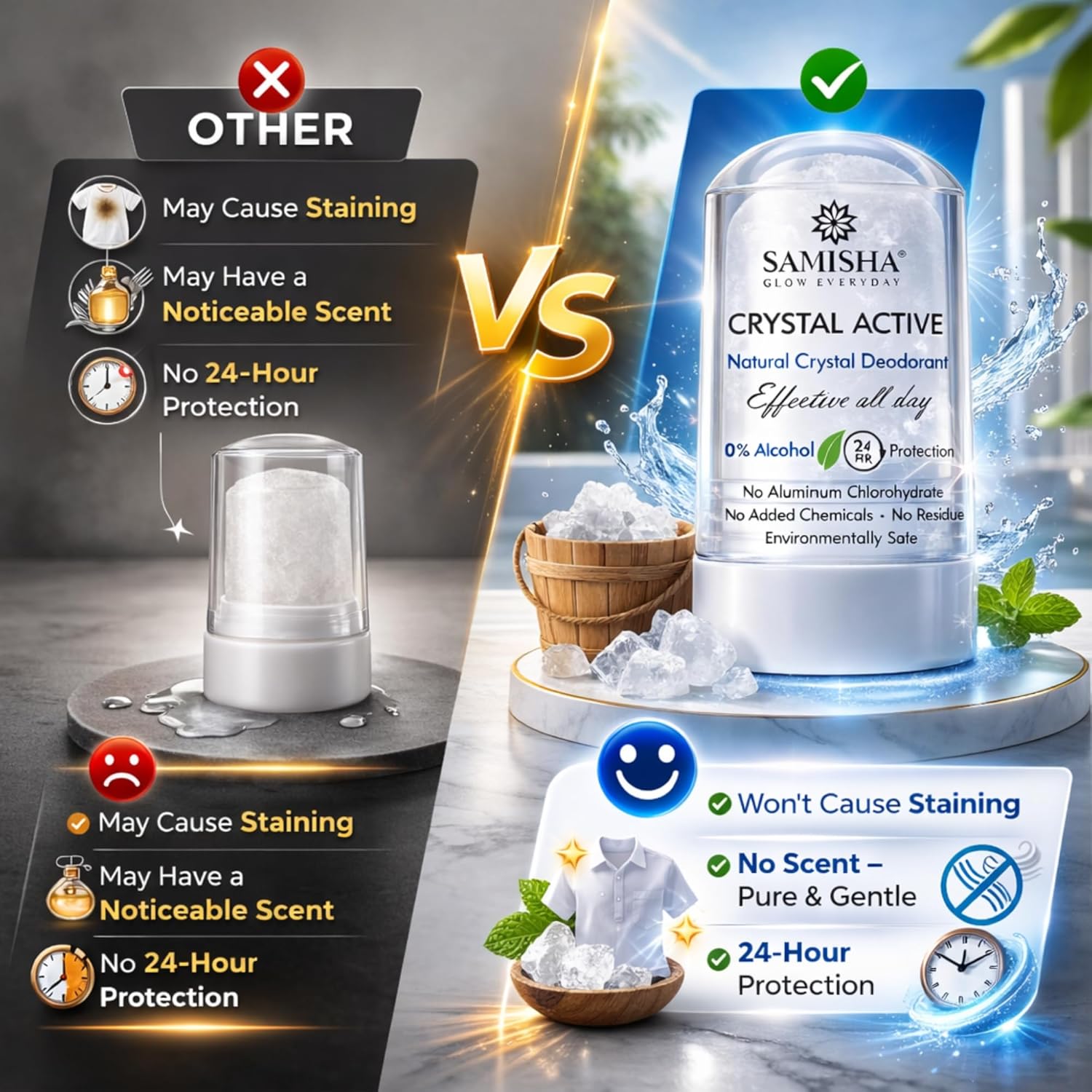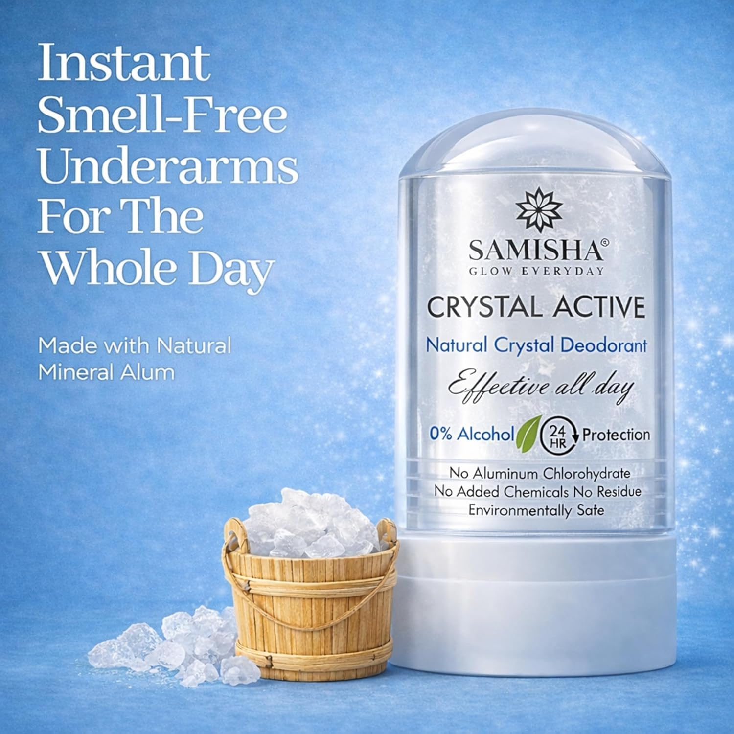 - Say goodbye to harsh chemicals with Samisha Crystal Deodorant. A 100% natural alum stone roll-on that provides 24-hour odor protection without aluminum or parabens. Lasts up to 2 years! Shop the eco-friendly choice for sensitive skin