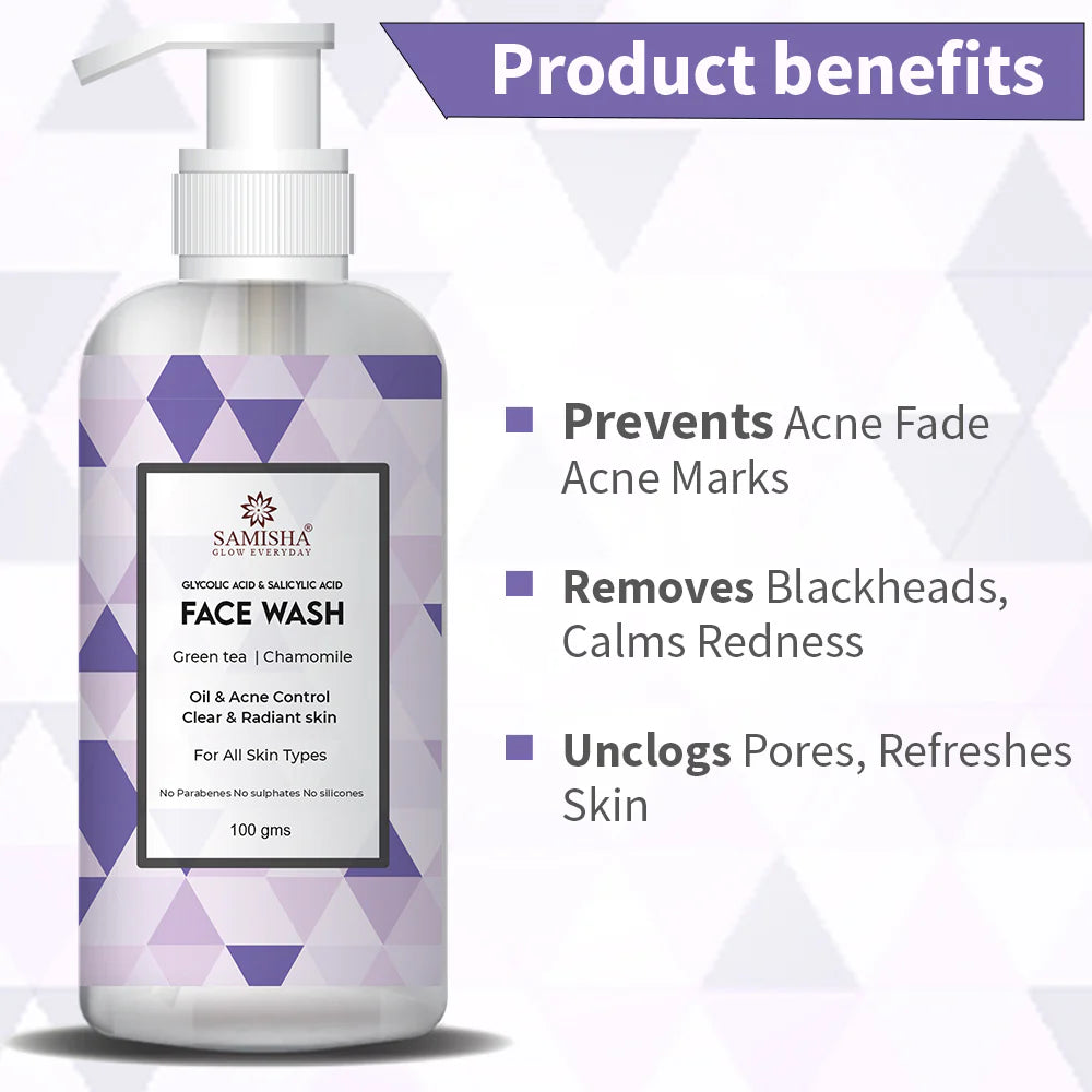 - Face wash for oily skin that fights acne in addition to battling future breakouts. It controls excess sebum-producing to guarantee that the skin doesn't generate even more oil than required. Samisha organic pimple free face wash works wonders in doing away with imperfections and also pimples. This acne glow face wash and glycolic acid cleanser is a perfect face wash for oily, combination skin, that is sensitive acne-prone skin.