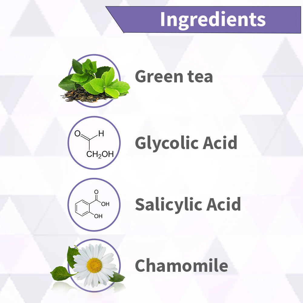 - Contains 0.1% glycolic acid & 1% salicyclic acid which are known to reduce acne and future breakouts.