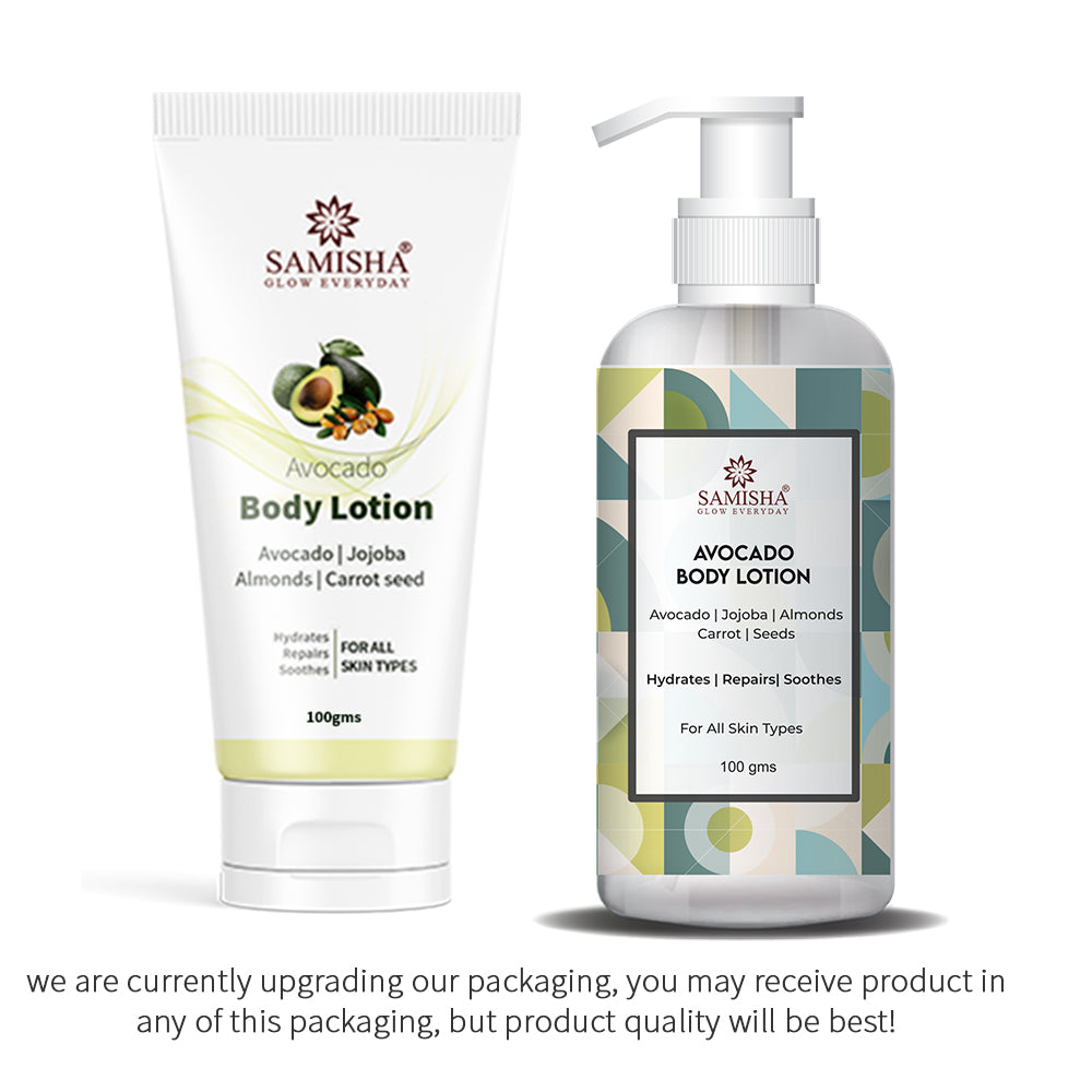 - Presenting Samisha Organic Avocado Body Lotion, which promotes even complexion and has anti-aging benefits. This organic body lotion for dry skin is light, absorbs quickly into the skin, and gets to work immediately, giving the skin the hydration it craves. Its made with all natural ingredients like Natural ingredients like almond oil, carrot seed oil, Shea Butter and Olive Oil which are excellent for skin healing and balancing the skin’s pH.